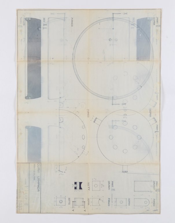 Una stampa eliografica del progetto della lampada "Curvi lampada" in scala 1:1