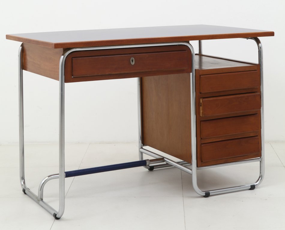 UNA SCRIVANIA RAZIONALISTATubo di acciaio cromato, legno di ciliegio, piano...