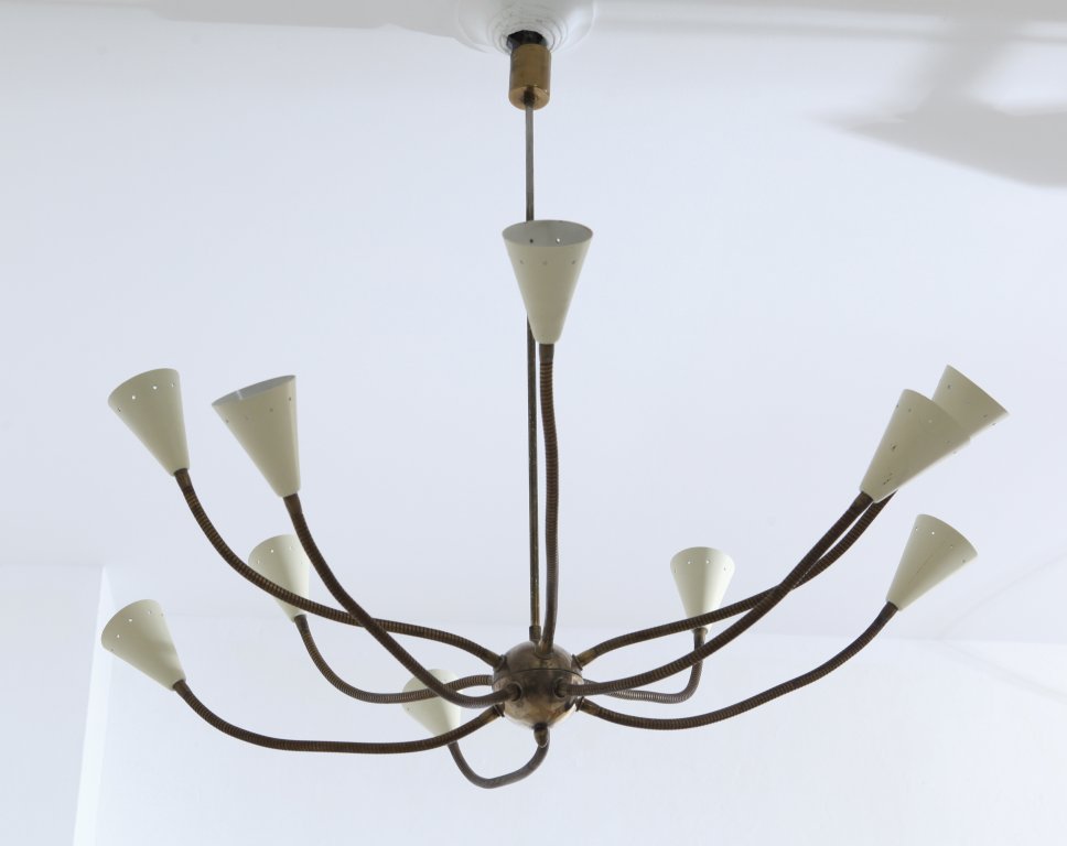 UNA LAMPADA A SOSPENSIONE, anni "50. Ottone, alluminio laccato. Altezza cm...
