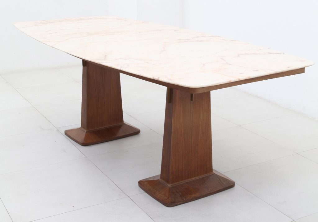 Lotto 1276 | UN TAVOLO, anni "50. Legno impiallacciato in mogano, ottone, marmo. Cm 86 (h)...