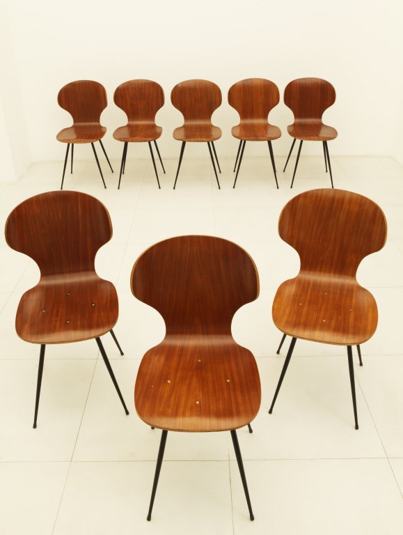 INDUSTRIA LEGNI CURVATI DI CARLO RATTI Otto sedie, anni "50. Ferro...