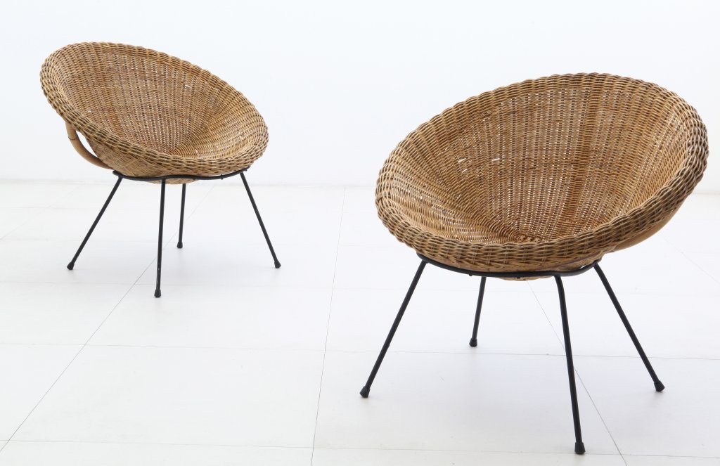 DUE POLTRONCINE, anni "50. Tondino di ferro verniciato, midollino. Altezza cm...