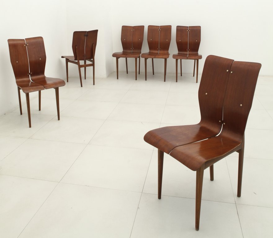 SEI SEDIE, anni "50. Legno di faggio tinto all"anilina, compensato curvato di...