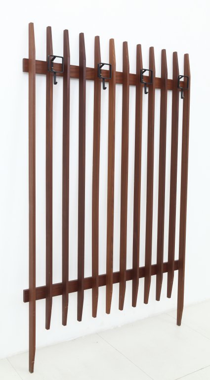 UN APPENDIABITI DA PARETE, anni "60. Legno di teak, ferro verniciato. Altezza...