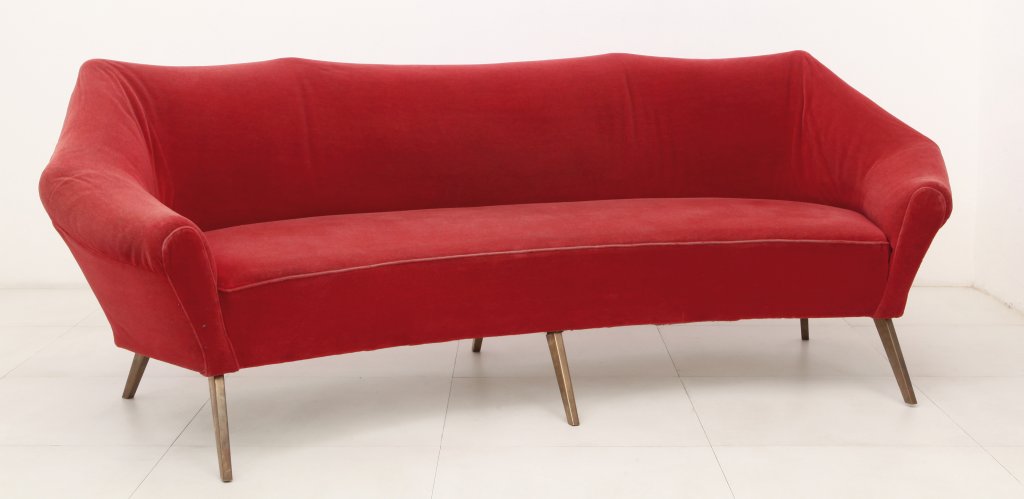 UN DIVANO, anni "60. Struttura e gambe in legno, imbottitura rivestita in...