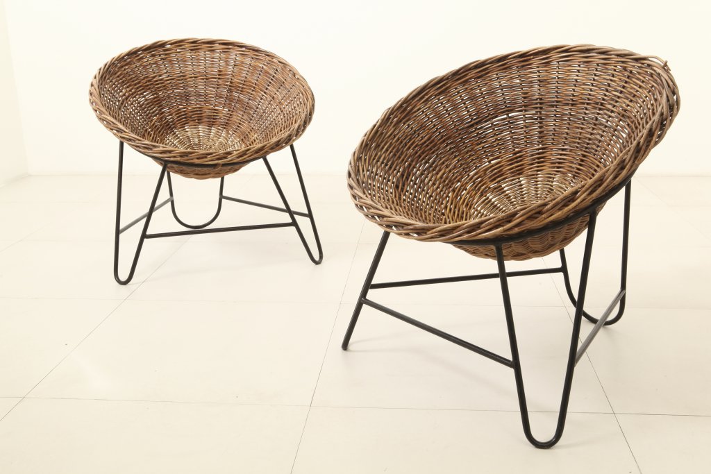 DUE POLTRONCINE, anni "60. Tondino di ferro verniciato, midollino. Altezza cm...