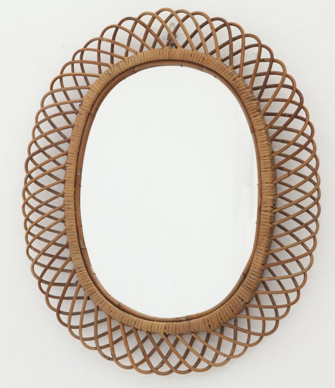 UNO SPECCHIO DA PARETE, anni "60. Bambù, giunco, canna d"India, cristallo...