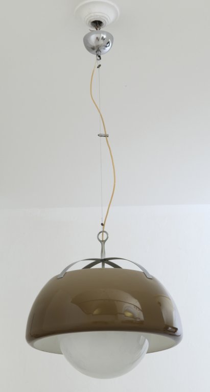 UN LAMPADARIO, anni "60. Metallo cromato, perspex, vetro opalino. Altezza...