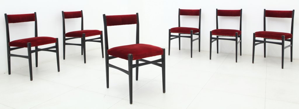 Sei sedie, anni "60. Legno verniciato, sedile e schienale imbottiti rivestiti...