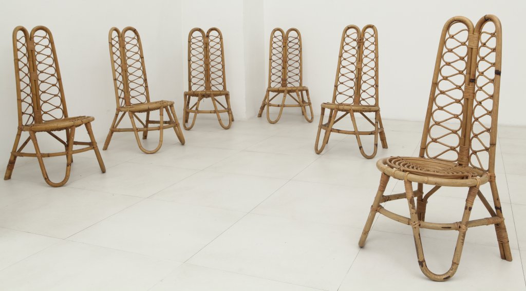 SEI SEDIE, anni "60. Malacca, giunco, canna d"India. Altezza cm 93, larghezza...