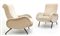 DUE POLTRONE, anni "60. Strutture in legno, gambe di ferro verniciato,...