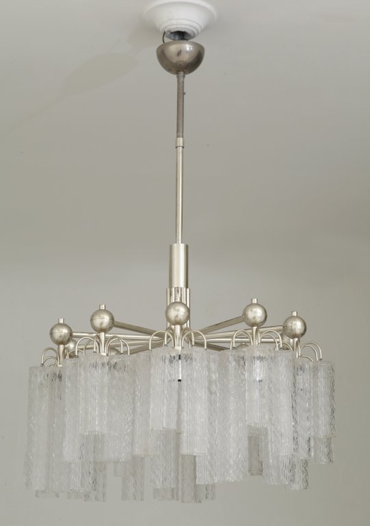 UN LAMPADARIO, anni "70. Metallo argentato, tubi di vetro formati in stampo....