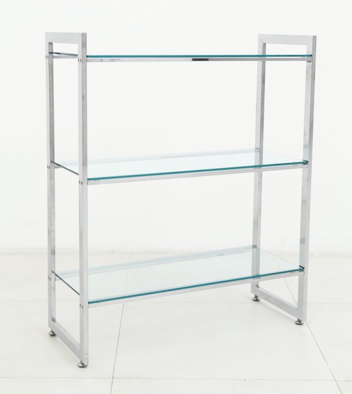 UNO SCAFFALE, anni 70. Acciaio cromato, cristallo, Cm 93 (h) x 76 x 30.