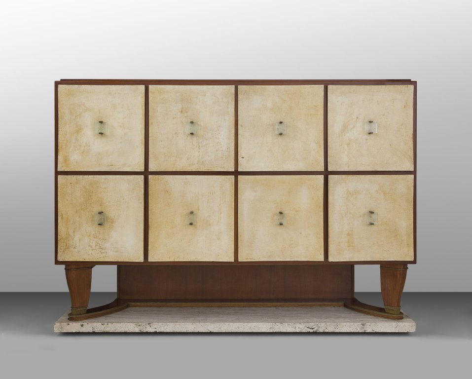 Walnut veneered wood, brass, concave surface doors covered with parchment,