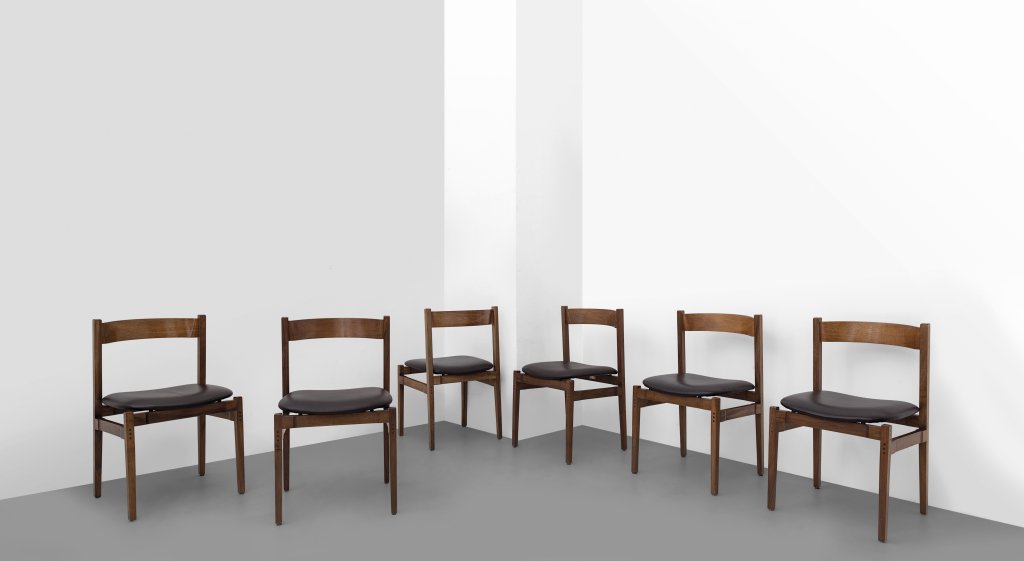 GIANFRANCO FRATTINISei sedie "101" per CASSINA, 1959. Legno di noce, sedili...