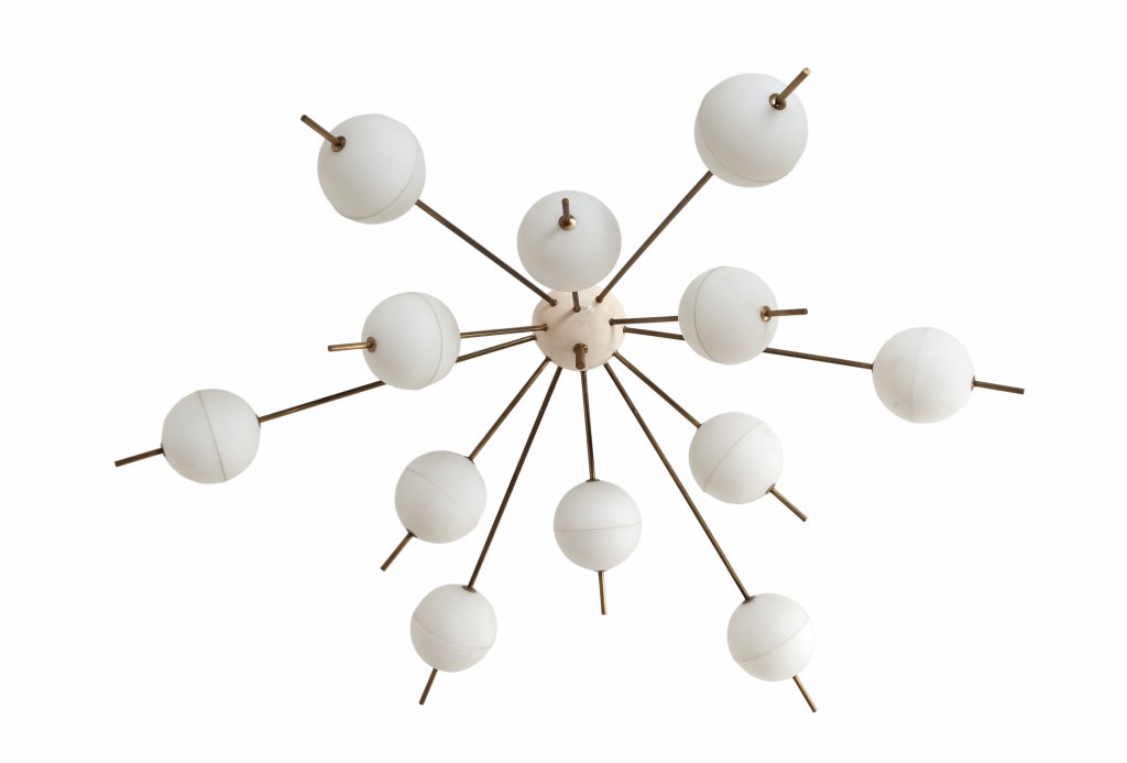 Brass, lacquered aluminum, and frosted opaline glass.
