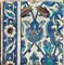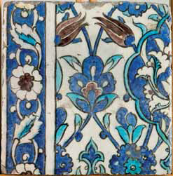 Piastrella, Damasco (Siria), fine del XVI/inizi del XVII secolo, dipinta in blu, turchese e manganese–viola con racemi vegetali e floreali intersecati da medaglioni e completata da una bordura laterale con corolle fiorite aperte, cm 21,5x21