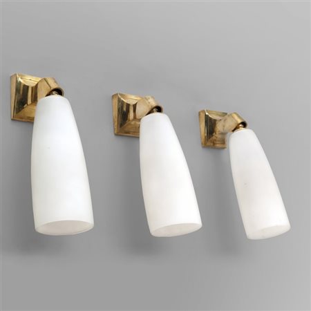 FONTANA ARTETre lampade a parete "2101", circa 1960. Ottone, vetro opalino...