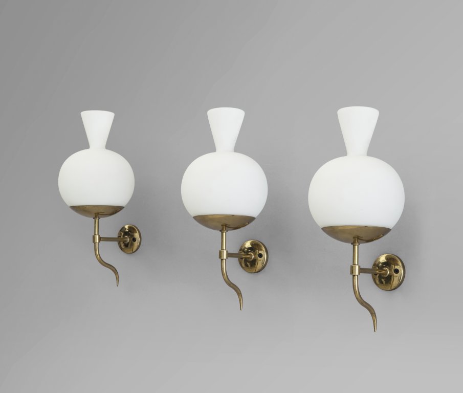 STILNOVO Tre lampade a parete, anni '60. Ottone, vetro opalino satinato....