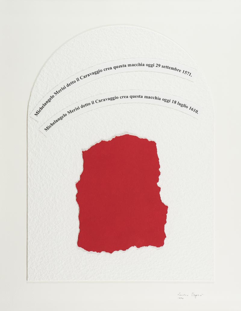 Emilio Isgrò (Barcellona di Sicilia (Me) 1937) Rosso Caravaggio, 1994 Collage su carta, cm. 65x50, in teca di plexiglas Firma e data in basso a destra; Sul verso: titolo, descrizione e codice CR1. Autentica dell'Artista su foto.