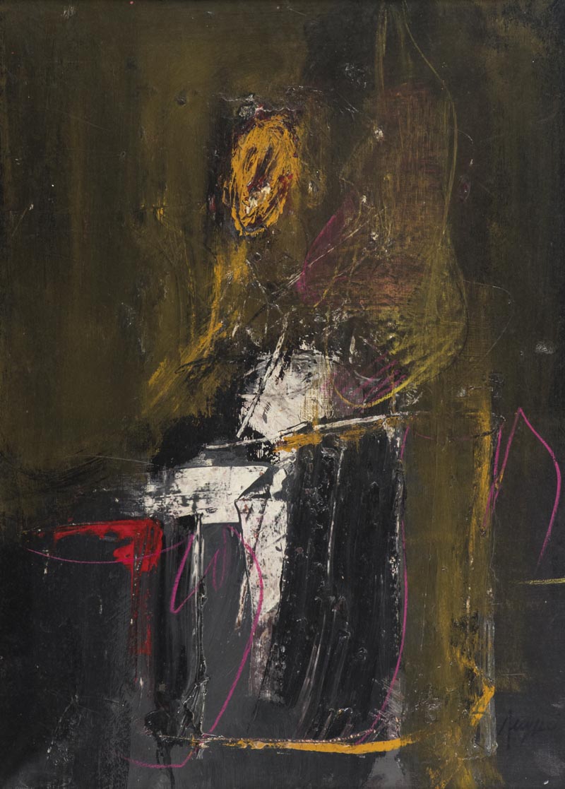 Piero Ruggeri (Torino 1930 - 2009) Interno, 1961 Olio su tela, cm. 66x48 Firmato in baso a destra; Sul verso: etichetta "Galleria La Bussola", Torino, con descrizione; Etichetta: "Galleria d'Arte Il Portico", Santa Margherita Ligure, con descrizione.