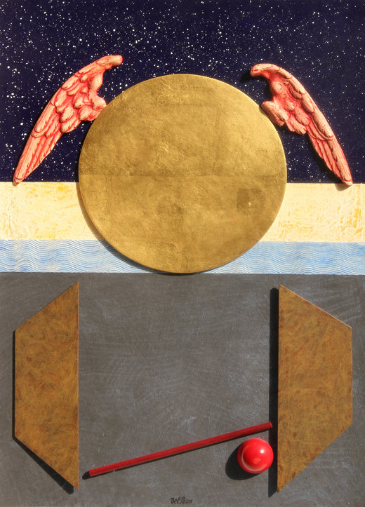 Lucio DEL PEZZO (Napoli 1933-) Esoterico, tecnica mista su tavola, cm. 65 x 45, Firma 'Del Pezzo' (in basso al centro) #Firma, titolo, tecnica, misure 'Lucio Del Pezzo, Esoterico, collage, colore acrilico, pigmento, gesso, oro in foglie, smalto su legno, cm. 65x45' (al retro) Autentica dell'Archivio Lucio Del Pezzo con numero 06270