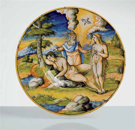 Piatto in maiolica istoriato con l’episodio della “Creazione di Adamo ed...