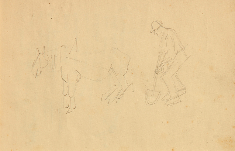 Fortunato DEPERO (Fondo 1892-Rovereto 1960) Aratura, 1938, grafite su carta, cm. 13 x 20, Datazione doppia: 1938/39 Autentica dell'Archivio Unico per il Catalogo delle Opere futuriste di Fortunato Depero, con n. FD-3732-DIS