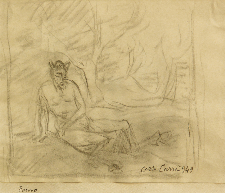 Carlo CARRA' (Quargnento 1881-Milano 1966) Fauno, 1949, grafite su carta applicata su cartoncino, cm. 19.2 x 23.5, La misura è riferita alla carta #Firma, data 'Carlo Carrà, 949' (in basso a destra); #titolo 'Fauno' (in basso a sinistra) Autentica a cura di Massimo Carrà #Certificato di provenienza della galleria La pietra, Martina Franca