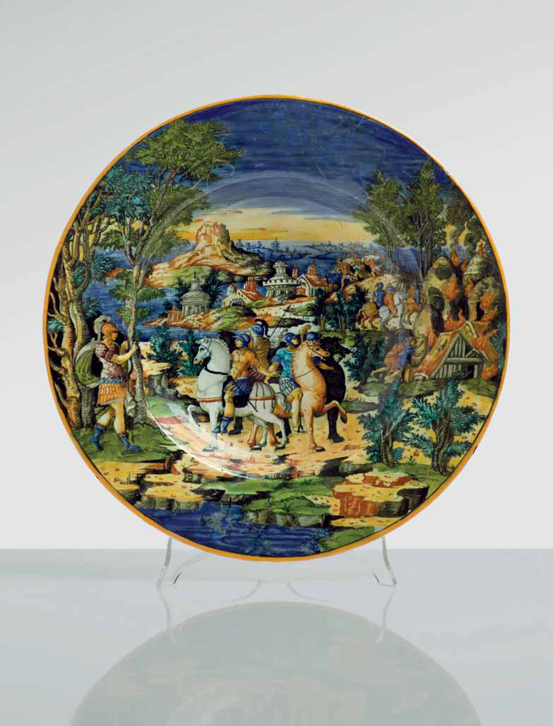 Piatto da pompa, Urbino, probabilmente bottega di Guido Durantino (Fontana), 1545–1565. Il distico sul rovescio legge: .53. / Annibale à Maharbale comanda / Fuor ch’à Galli, dar guasto in ogni banda. Diametro cm 41; restauri. Così come descritta nella grande opera storica in 142 libri di Tito Livio Ab Urbe condita libri (storia di Roma dalla fondazione alla morte di Druso nel 9 d.C.), la scena istoriata (libro XXI, capitolo 45, 1–4) è tratta dalla narrazione della famosa “Battaglia del Ticino” che rappresentò, nella seconda Guerra Punica, lo scontro diretto e la prima vittoria di Annibale contro Roma (218 a.C). L’appartenenza di questa maiolica ad uno dei corredi istoriati più ambiziosi ed interessanti realizzati ad Urbino intorno alla metà del Cinquecento è dettagliatamente discussa da Timothy Wilson riguardo ad un esemplare analogo pubblicato nel 1996 in Italian Maiolica of the Renaissance, riproposto nel 2006 nel primo volume delle collezioni della Fondazione Cassa di Risparmio di Perugia. Del servizio, che è interamente incentrato su episodi della seconda Guerra Punica tra Roma e Cartagine (219–217 a.C.), si distinguono due categorie: i primi episodi della guerra illustrati riportano iscrizioni in rima sul verso e sono caratterizzati sul fronte da un’area originariamente predisposta per ospitare uno stemma mai eseguito (cfr. D. Thornton and T. Wilson 2009); i pezzi istoriati con episodi successivi della guerra hanno simili distici preceduti da numerali arabi. Tra questi ultimi si registrano i tre bacili trilobati custoditi al Bargello, numerati 41, 43 e 44, unitamente ad un’ampia serie di piatti numerati dal 47 al 114, di cui solo 25 esemplari sono attualmente noti ed ai quali va ora ad aggiungersi il presente esemplare. Non essendo emerso alcun prototipo iconografico per l’intero corredo, che Wilson definisce essere il più eccezionale resoconto sistematico di storia classica dipinto ad Urbino, maggiormente affascinante è la sua committenza che, seppure non documentata con precisione, sembra rimandare alla prestigiosa collezione cinquecentesca dei Medici, Granduchi di Toscana. Nel presentare tale ipotesi lo studioso cita sia l’inventario mediceo del 1588 in merito ai tre bacili oggi al Bargello, che quello del 1784 riguardo ad alcuni di questi piatti, ma soprattutto propone una preziosa trascrizione del 1735 che descrive come una parte importante del servizio fosse stata trasferita tempo addietro da Firenze a Locarno. Poiché nel testo si menziona l’incompleta sequenza degli esemplari giacenti in Svizzera, da cui scaturì la rinuncia del Granduca di Firenze all’epoca a chiederne la restituzione, se ne deduce che la serie era numerata e siccome non esiste un altro corredo istoriato dedicato ad Annibale, appare credibile che tali pezzi appartenessero al medesimo servizio del piatto in esame. Bibliografia: T. Wilson, Italian Maiolica of the Renaissance, 1996, n. 122, p. 290–292. T. Wilson, E.P. Sani, Le maioliche rinascimentali nelle collezioni della Fondazione Cassa di Risparmio di Perugia – I, 2006, n. 54, p. 162–165. D. Thornton and T. Wilson, Italian Renaissance Ceramics – A catalogue of the British Museum Collection – I, 2009, n. 192–193, p. 326–328.
