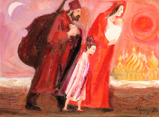 Trento LONGARETTI (Treviglio 1916-) Viandanti della vecchia Russia, anni 90, olio su tela, cm. 30 x 40, Firma 'T. Longaretti' (in basso a destra) #Firma, titolo, misure 'T. Longaretti, Viandanti della vecchia Russia, 30x40' (al retro) Autentica dell'artista su fotografia