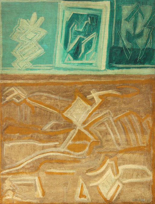 Riccardo LICATA (Torino 1929-Venezia, 2014) Pittura, 1965, olio su tela, cm. 80 x 60, Firma, data 'Licata, 65' (in basso a destra) #Etichetta del VIII Premio di Pittura, Mestre, 1965, firmata dall'artista; #etichetta della galleria d'arte Torbandena, Trieste; #timbro di Modern art agency, Napoli (al retro)