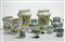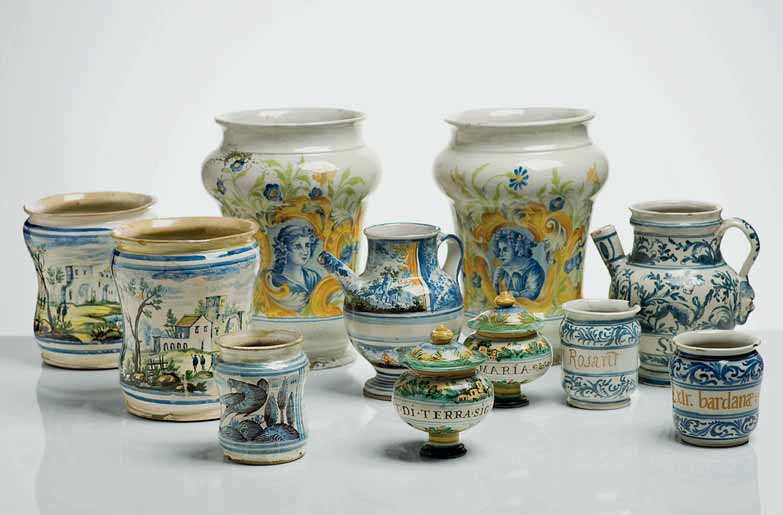 Orciolo in maiolica Liguria, XVIII secolo, dipinto in monocromo di cobalto con motivi “calligrafico-naturalistici” e cartiglio centrale con la dicitura Syr^de^donior, altezza cm 22; minime cadute di smalto. Unito ad due piccoli albarelli Liguria, XVIII secolo, ornati in blu cobalto con fasce a girali vegetali e scritte in antimonio: Conser. Rosarit ed Extr. Bardanae, altezza cm 11,5; lievi mancanze.
