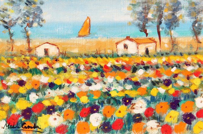 Michele CASCELLA (Ortona (Ch) 1892-Milano 1989) Campo di papaveri, anni 80, olio su tela, cm. 20 x 30, Firma 'Michele Cascella' (in basso a sinistra) #Firma 'Da me dipinto Michele Cascella' (al retro) Autentica dell'artista su fotografia