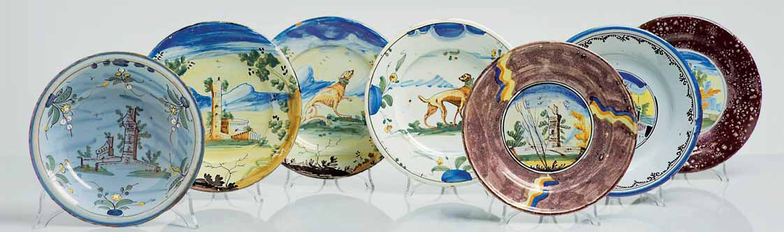 Gruppo composto da tredici piatti e una ciotola in maiolica policroma a gran fuoco, Pavia e Lodi, prima metà XVIII secolo, con soggetti zoomorfi o architetture in contesto vegetale naturalistico, accomunati da un rivestimento stannifero del biscotto leggermente azzurrato. Alcuni presentano una decorazione con ciuffi vegetali stilizzati sul verso. Misure diverse; lievi danni.