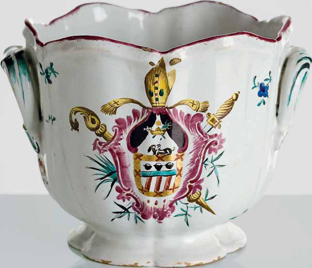 Rinfrescatoio per bottiglia in maiolica con emblema araldico, Bologna, manifattura Giuseppe Finck, 1767-1789. Marca: F. dipinta in azzurro sotto la base. Altezza cm 14,5; lieve sbeccatura alla base ed una félure consolidata in restauro. Sciò da bottiglia o botiglia è il termine designato ad indicare questi manufatti negli inventari di fabbrica e la sua morfologia è quella tradizionalmente nota del repertorio bolognese. L’ornato policromo è realizzato a terzo fuoco con aggiunta di dorature e propone da un lato un elaborato emblema araldico e dall’altro una composizione floreale di gusto naturalistico con la caratteristica rosa porpora come protagonista del mazzo. Se il mazzetto floreale evidenzia tutte le connotazioni botaniche tipiche di questa produzione, il motivo araldico è fonte di sicuro interesse per la sporadica presenza che a tutt’oggi si registra di corredi stemmati realizzati dalla manifattura. Le collezioni del Museo Internazionale delle Ceramiche a Faenza offrono l’eccezionale testimonianza di un coperchio di salsiera (Inv. n. 2142), purtroppo orfano del corpo di appartenenza, caricato dell’arme araldica presente sul nostro rinfrescatoio, a cui possiamo aggiungere solo la recente comparsa di una coppia di piatti da coltello con identico emblema, pubblicati nel catalogo della mostra Le più belle maioliche – Capolavori di Colle Ameno, Rolandi e Finck nella Bologna del Settecento, realizzata presso il Museo Medievale della città e da poco conclusasi (26–11–2011/4–3–2012). Benché non si sia ancora riusciti a sciogliere il nome della proprietà che si cela dietro questo emblema nobiliare, la sua formulazione ci permette di asserire con certezza che il servito fosse destinato ad un alto prelato e precisamente un abate mitrato dell’ordine dei Domenicani.