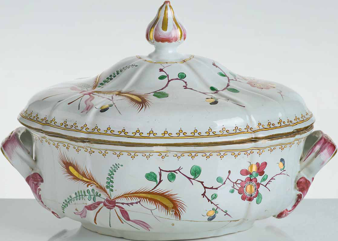 Zuppiera con coperchio in maiolica a penne d’oro. Bologna, manifattura Giuseppe Finck, 1767–1789. Cm 35x26; altezza cm 22.5; rotture alla base del corpo ricomposte in restauro, a vista. La decorazione è eseguita in policromia a terzo fuoco con uno dei più raffinati motivi ornamentali della gamma produttiva di maiolica bolognese nella manifattura Finck: la composizione prevede due penne incrociate e divergenti, unite a rametti fogliati ed un lungo stelo fiorito a linee spezzate che svetta dal mazzo, trattenuti da un nastro annodato alla base. La cromia contrappone l’impiego contrastato di rosso ferro acceso e porpora, uniti ad un bel verde brillante per le foglie; il tutto impreziosito da dorature di ottima qualità. Un filetto bruno delimita gli orli di corpo e coperchio, evidenziati da bordure a merletto in giallo brillante e profilate di rosso. I fondamentali studi di Bertocchi e Liverani (1982), che per primi hanno dato luce ai manufatti bolognesi per decenni scambiati come faentini, pubblicano parzialmente l’unico inventario di fabbrica rinvenuto e risalente al 1796, al tempo della gestione del fratello Leopoldo, in cui è facile riconoscere questo decoro nel motivo indicato a penne d’oro. L’intensa attività della manifattura bolognese non è tuttavia supportata da documentazioni archivistiche esaustive per una disamina completa dell’intero ciclo produttivo e della metodologia applicata alle marcature. Seppure il nostro esemplare sia sprovvisto di marca, alcuni pezzi della stessa gamma ornamentale sono siglati F. in azzurro, tra cui uno appartiene alle Civiche Raccolte d’Arti Applicate del Castello Sforzesco di Milano ed è pubblicato in catalogo (AA.VV. 2001). Gli esemplari di questa tipologia sono piuttosto rari e per quanto riguarda la maiolica in esame si tratta di una delle due sole zuppiere ad oggi note e precisamente quella pubblicata da Saul Levy nel 1964, un tempo in collezione Tullio Silva a Milano. L’altra, anch’essa sprovvista di marca, è riprodotta nella monografia sulle ceramiche bolognesi di Bertocchi e Liverani (1982). Bibliografia: AA.VV., Museo d’Arti Applicate – Ceramiche II, Milano 2001, Tav. 553, pp. 559-560. S. Levy, Maioliche Settecentesche piemontesi, liguri, romagnole, marchigiane, toscane e abruzzesi, 1964,Tav. 200. G. Bertocchi, F. Liverani, Ceramiche bolognesi del Settecento, 1982, Tav. 66.