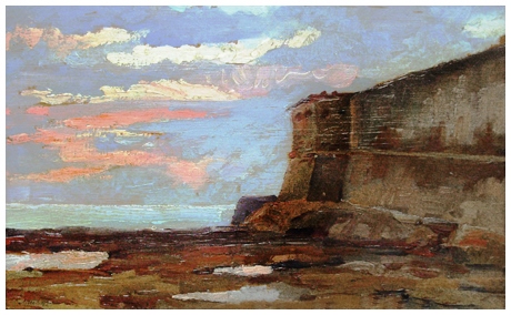 MARIO MENICHETTI Livorno 1889 – Livorno 1975 Scogliere S. Leopoldo – Livorno Olio su tavola 20 x 30. Firma in b. a s.; sul verso varie scritte con le date dell’autore + firma ignota + etichetta galleria Farsetti Arte, Prato, 16 aprile 2011, n.574. B.A.: 90