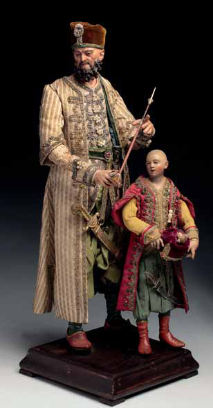 Capo-palafreniere barbuto, di Giuseppe Gori e “Paggetto di Baldassarre” di Lorenzo Mosca o di Genzano (prov. di entrambi collezione Rivelli), il palafreniere con bella vestitura costituita da un lungo copriabito in seta a fasce giallo chiaro e giallo scuro su pantaloni di seta verde oliva e giacca in damasco avorio e giallo; il paggetto con copriabito rosso, pantaloni verdi e corpetto giallo. Altezza cm 38 e cm 27; fine secolo XVIII Accessori: pipa, scimitarra, pugnale e due cappelli
