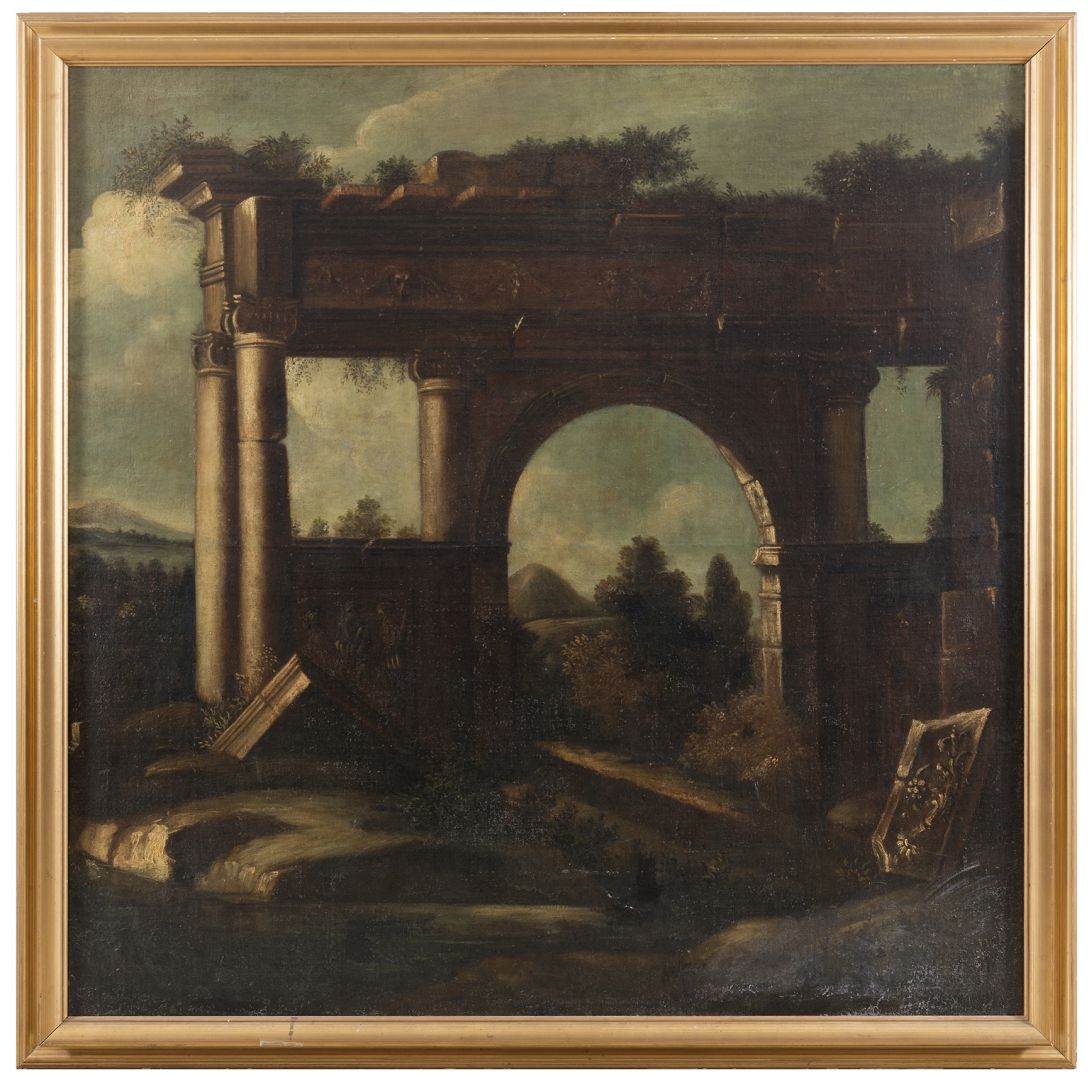 PITTORE ITALIANO FINE XVII SECOLO Paesaggio con capriccio Olio su tela cm 153...