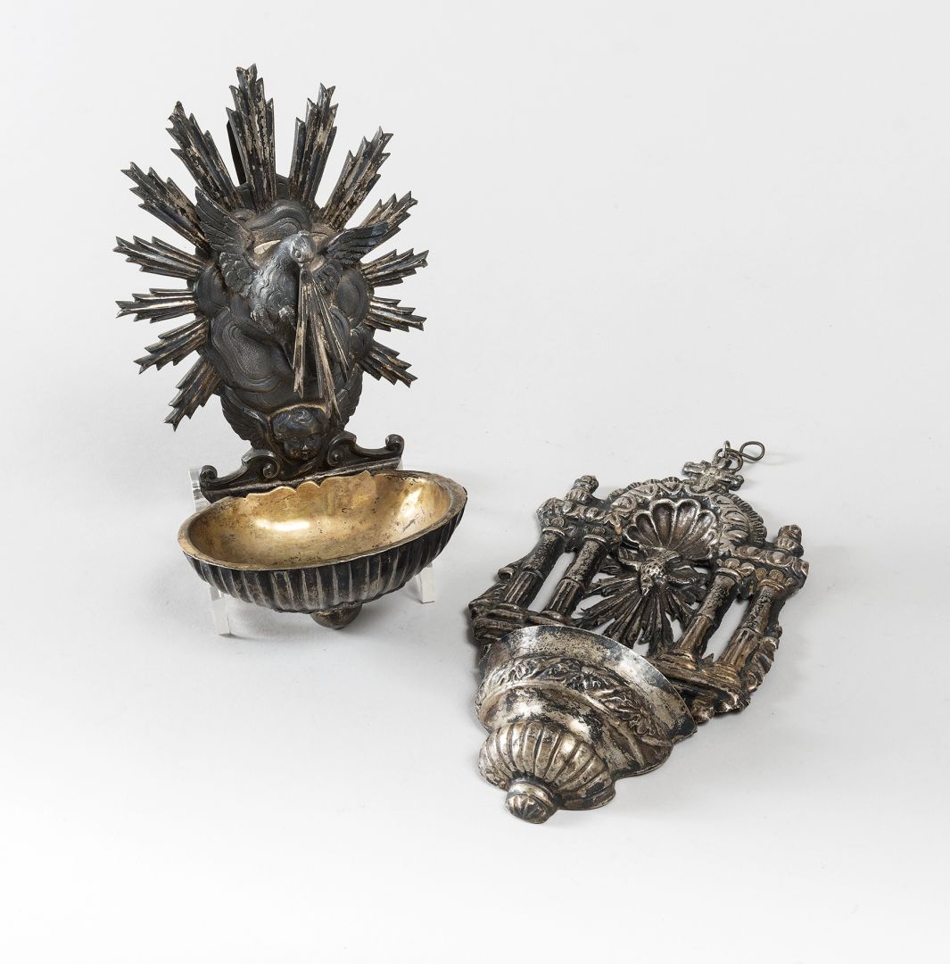 DUE ACQUASANTIERE IN ARGENTO XVIII SECOLO Una con aquila e raggiera sorretta...