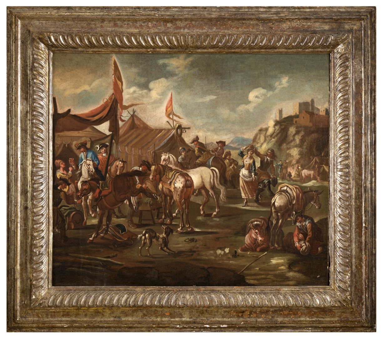 PITTORE DEL XVIII SECOLO Accampamento di soldati Olio su tela cm 58 x 68...