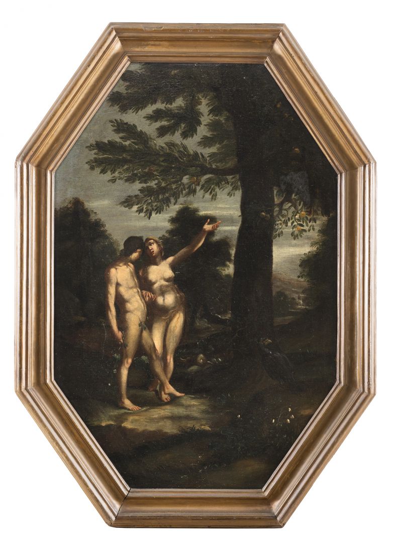 PITTORE ITALIANO XVII SECOLO Adamo ed Eva Olio su tela ottagonale, cm 81 x 53