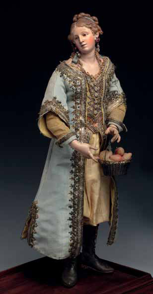 Georgiana di Giuseppe Gori, (provenienza collezione Scuotto), con mantello turchino su pantaloni in seta gialla dalla bella acconciatura trattenuta da un nastro celeste Altezza cm 37; fine secolo XVIII Accessori: collana e orecchini in metallo dorato; cestino in metallo con frutta