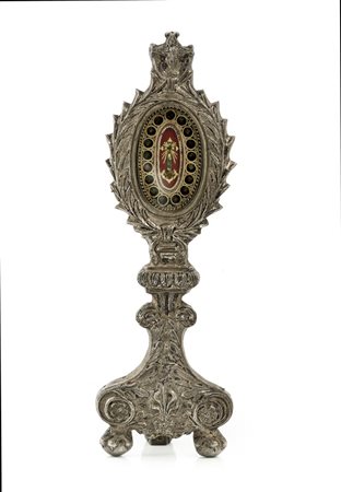 RELIQUARIO In legno di noce con fronte in argento con decoro a sbalzo, teca...