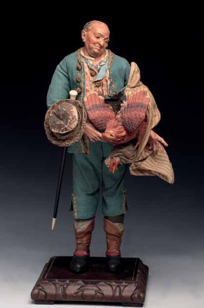 Contadino in abiti da festa definito nel vecchio inventario “Uomo delle galline, testa volta a sinistra inclinata sul collo, capelli grigi, porro di fianco alla bocca sulla guancia sinistra, di Giuseppe Sammartino (prov. collezione Scuotto). Abito in seta azzurra, panciotto a disegni gialli su rosso in fasce verticali e grande strofinaccio rigato, le calze ricadenti modellate. Altezza cm 33; fine secolo XVIII Accessori: gallina svolazzante e testa di un’altra gallina fuoriscente dalla bisaccia, di Tommaso Schettino, cappello e bastone con pomo e puntale in avorio