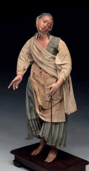 Zingara stanca con straccio modellato sulla testa, di Giuseppe Gori, (prov. Oderisio Menna), la bella figura di mendicante a piedi nudi, dall’espressione triste finalizzata a commuovere i passanti, con bella vestitura dalla gonna a fasce verde e avorio, camicia e grembiule stracciati e rammendati e una lunga fascia sulla spalla destra a righe verdi su fondo bianco. Altezza cm 29; fine secolo XVIII Accessori: spiedino per arrosto
