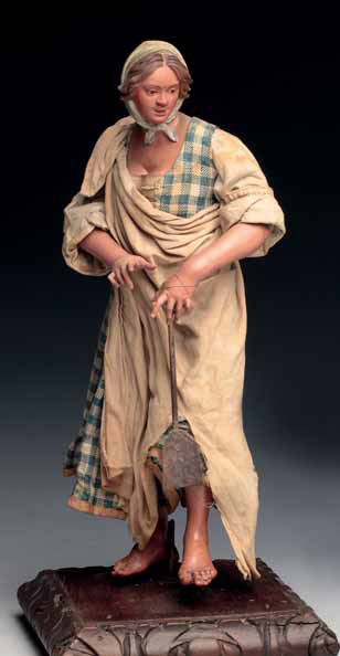Zingara con sciarpa modellata intorno al viso, di Giuseppe Sammartino, (prov. presepe di Alessio Papale), bellissima figura a piedi nudi vestita in seta a quadri azzurri e bianchi e avvolta in un panno di tela bianca. Altezza cm 27; fine secolo XVIII Accessori: paletta in ferro
