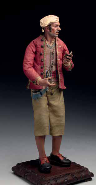Giocatore mirante a sinistra, bocca aperta mostrante i denti superiori al numero di quattro, fedine a capo calvo, porro sulla gota sinistra in basso, di Salvatore di Franco (prov. collezione Agresti); indossa pantaloni verde chiaro, giacca in seta operata rossa su corpetto avorio. Altezza cm 36; fine secolo XVIII Accessori: carta da gioco e berretto bianco da pescatore