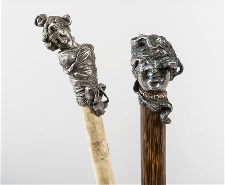 DUE POMI IN ARGENTO PER BASTONE Argento cesellato. Uno raffigurante dea...